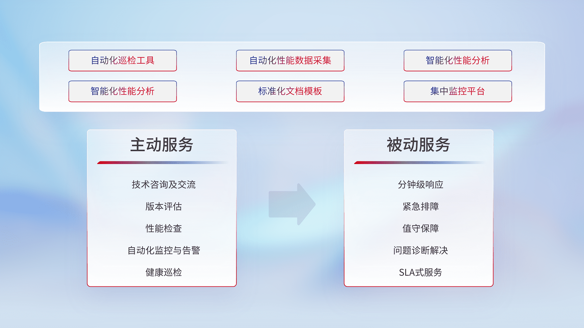 智能化工具和标准化文档,,,,保障服务质量,,提供主动服务(包含技术咨询、、版本评估、、、、性能检查、、、自动化监控与告警、、、健康巡检)和被动服务包含(分钟级响应、、、、紧急排障、、、、值守保障、、、问题诊断解决、、SLA服务)。。